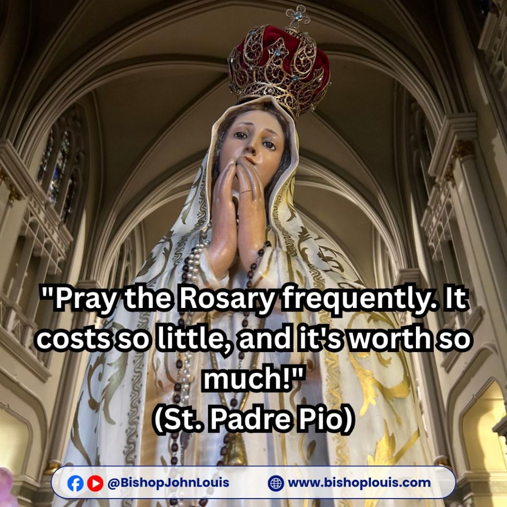 QUOTES ON THE HOLY ROSARY – 25th OctoberBy Bishop John Kobina Louis / October 25, 2025 / Quotes / 1 minute of reading On Praying the Rosary Always “Pray the Rosary frequently. It costs so little, and it’s worth so much!”(St. Padre Pio) Share this with a friend WhatsApp Facebook Twitter / X Pinterest Linkedin