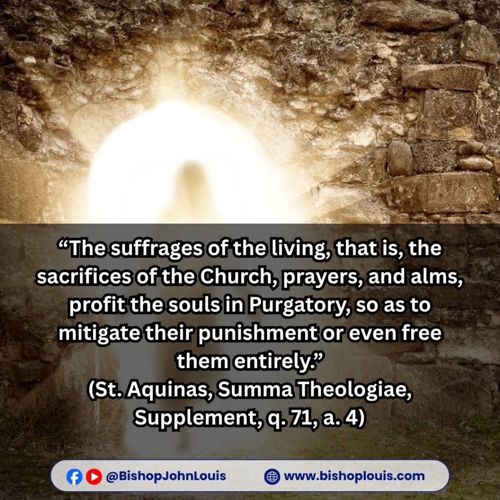 “The suffrages of the living, that is, the sacrifices of the Church, prayers, and alms, profit the souls in Purgatory, so as to mitigate their punishment or even free them entirely.”