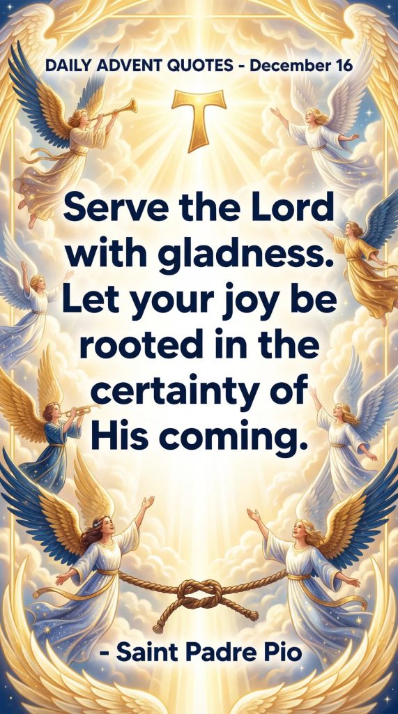 DAILY ADVENT QUOTES – December 16By Bishop John Kobina Louis / December 16, 2025 / Quotes / 1 minute of reading Saint Padre Pio“Serve the Lord with gladness.Let your joy be rooted in the certainty of His coming.” Share this with a friend WhatsApp Facebook Twitter / X Pinterest Linkedin