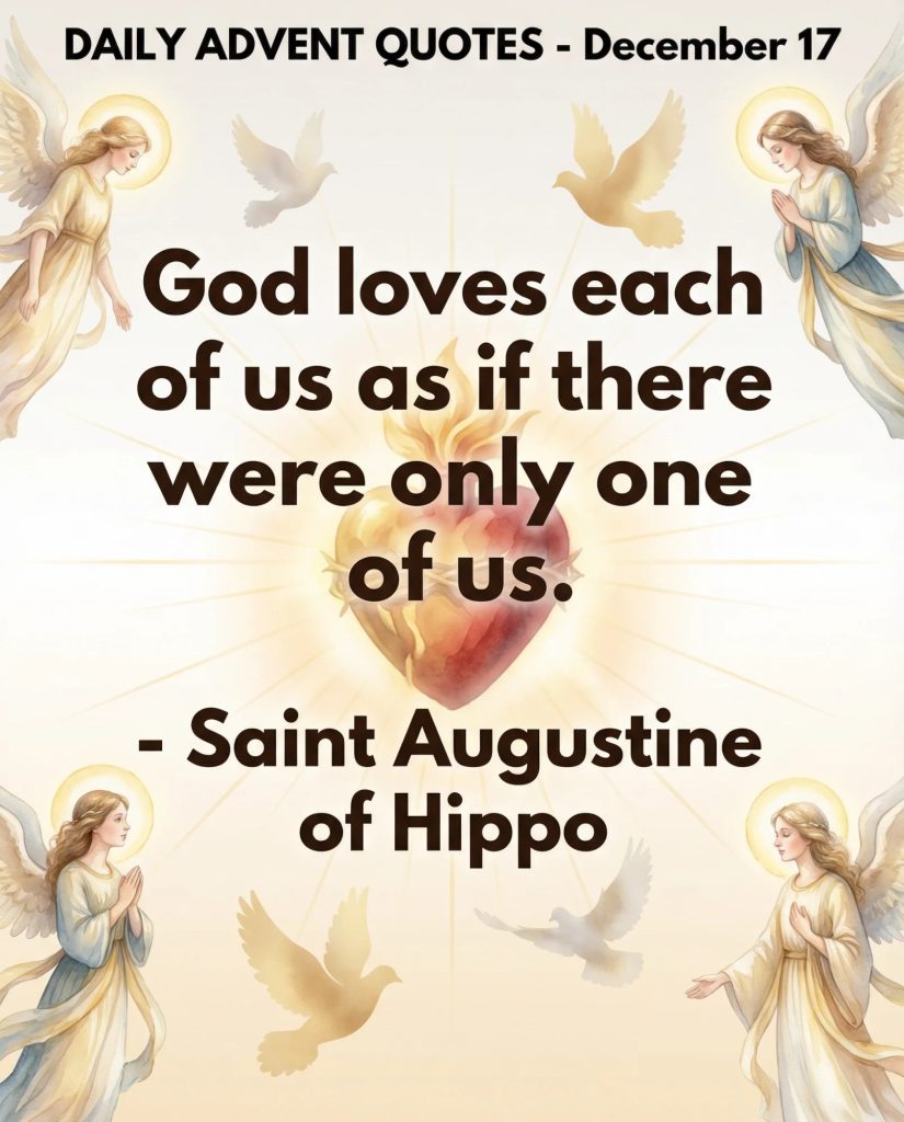 DAILY ADVENT QUOTES – December 17By Bishop John Kobina Louis / December 17, 2025 / Quotes / 1 minute of reading Saint Augustine of Hippo“God loves each of us as if there were only one of us.” Share this with a friend WhatsApp Facebook Twitter / X Pinterest Linkedin