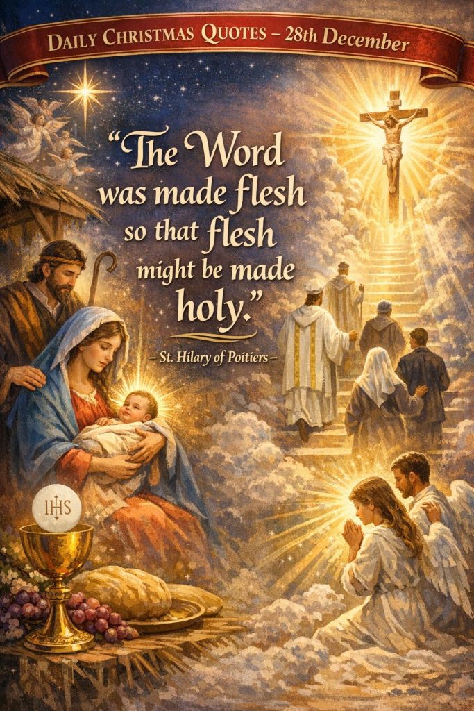 DAILY CHRISTMAS QUOTES – 28th DecemberBy Bishop John Kobina Louis / December 28, 2025 / Quotes / 1 minute of reading St. Hilary of Poitiers – “The Word was made flesh so that flesh might be made holy.” Share this with a friend WhatsApp Facebook Twitter / X Pinterest Linkedin