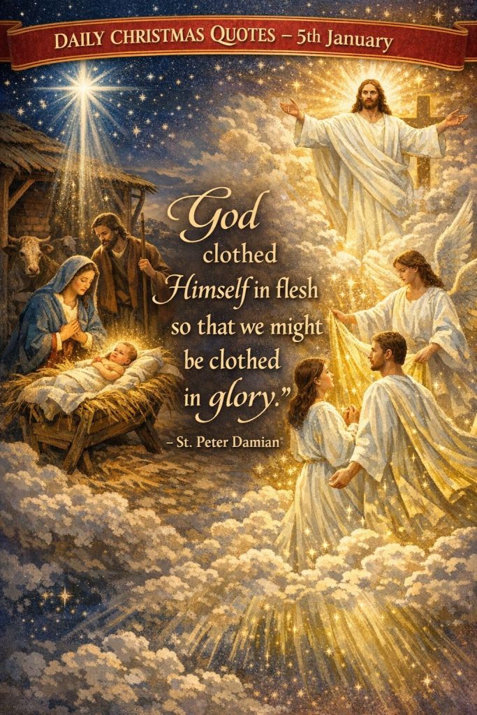 DAILY CHRISTMAS QUOTES – 5th JanuaryBy Bishop John Kobina Louis / January 5, 2026 / Quotes / 1 minute of reading St. Peter Damian – “God clothed Himself in flesh so that we might be clothed in glory.” Share this with a friend WhatsApp Facebook Twitter / X Pinterest Linkedin