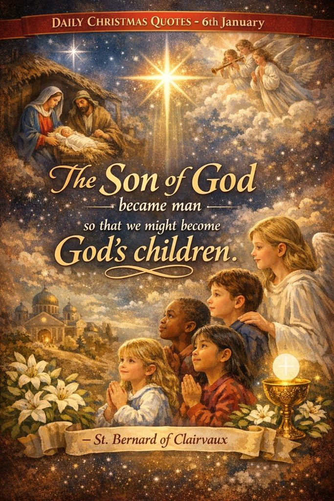 DAILY CHRISTMAS QUOTES – 6th JanuaryBy Bishop John Kobina Louis / January 6, 2026 / Quotes / 1 minute of reading St. Bernard of Clairvaux – “The Son of God became man so that we might become God’s children.” Share this with a friend WhatsApp Facebook Twitter / X Pinterest Linkedin