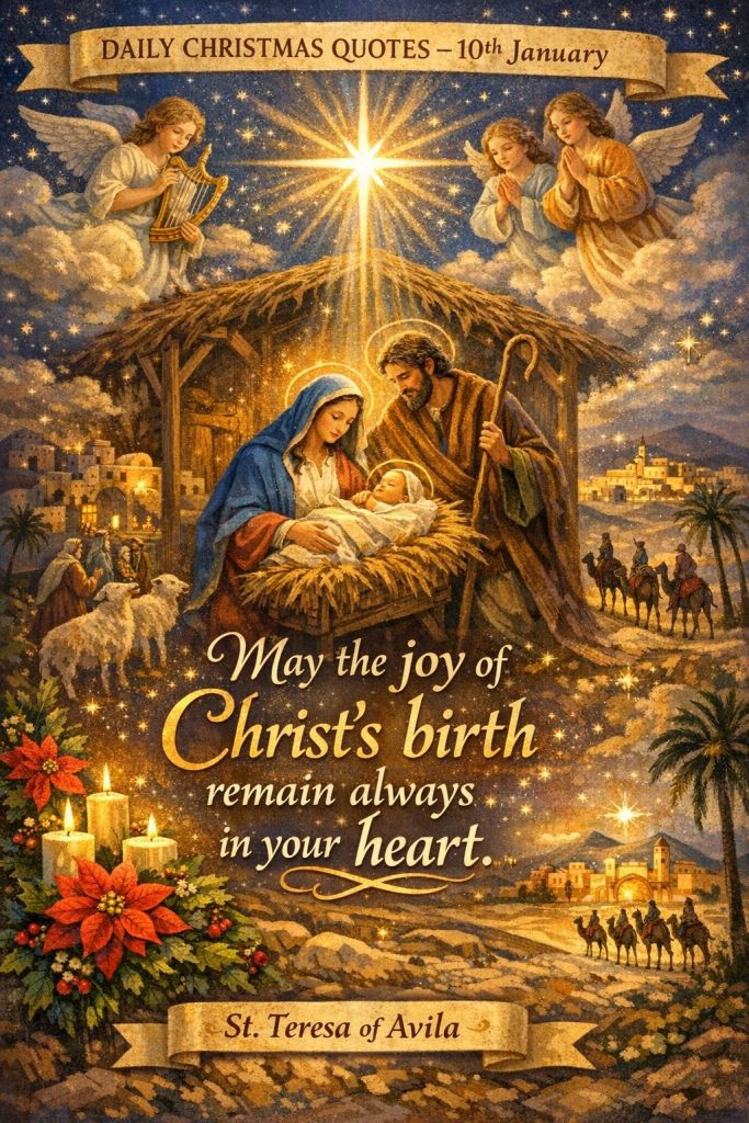 DAILY CHRISTMAS QUOTES – 10th JanuaryBy Bishop John Kobina Louis / January 10, 2026 / Quotes / 1 minute of reading St. Teresa of Avila – “May the joy of Christ’s birth remain always in your heart.” Share this with a friend WhatsApp Facebook Twitter / X Pinterest Linkedin