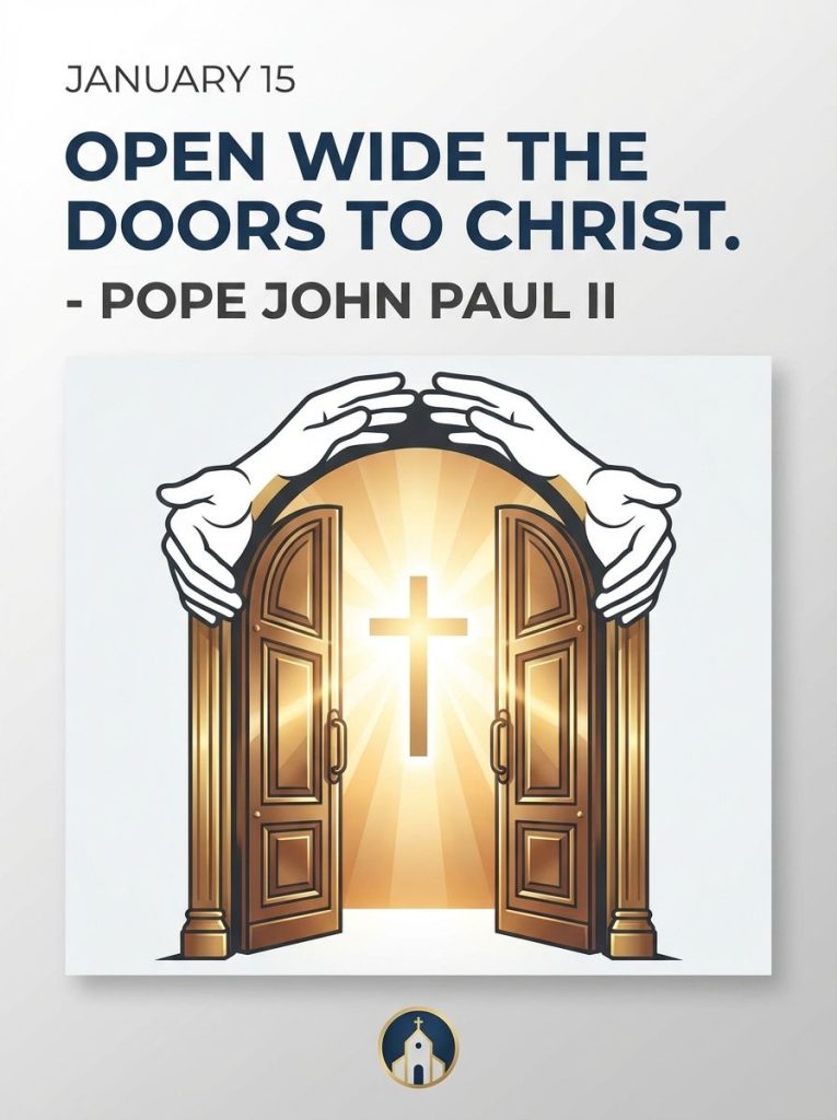 Daily Catholic Quote for 15th JanuaryBy Bishop John Kobina Louis / January 15, 2026 / Quotes / 1 minute of reading Pope St. John Paul II:“Do not be afraid. Open wide the doors for Christ.” Share this with a friend WhatsApp Facebook Twitter / X Pinterest Linkedin