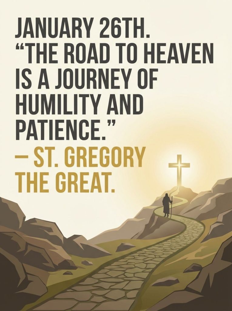 Daily Catholic Quote for 26th JanuaryBy Bishop John Kobina Louis / January 26, 2026 / Quotes / 1 minute of reading St. Gregory the Great:“The road to heaven is a journey of humility and patience.” Share this with a friend WhatsApp Facebook Twitter / X Pinterest Linkedin