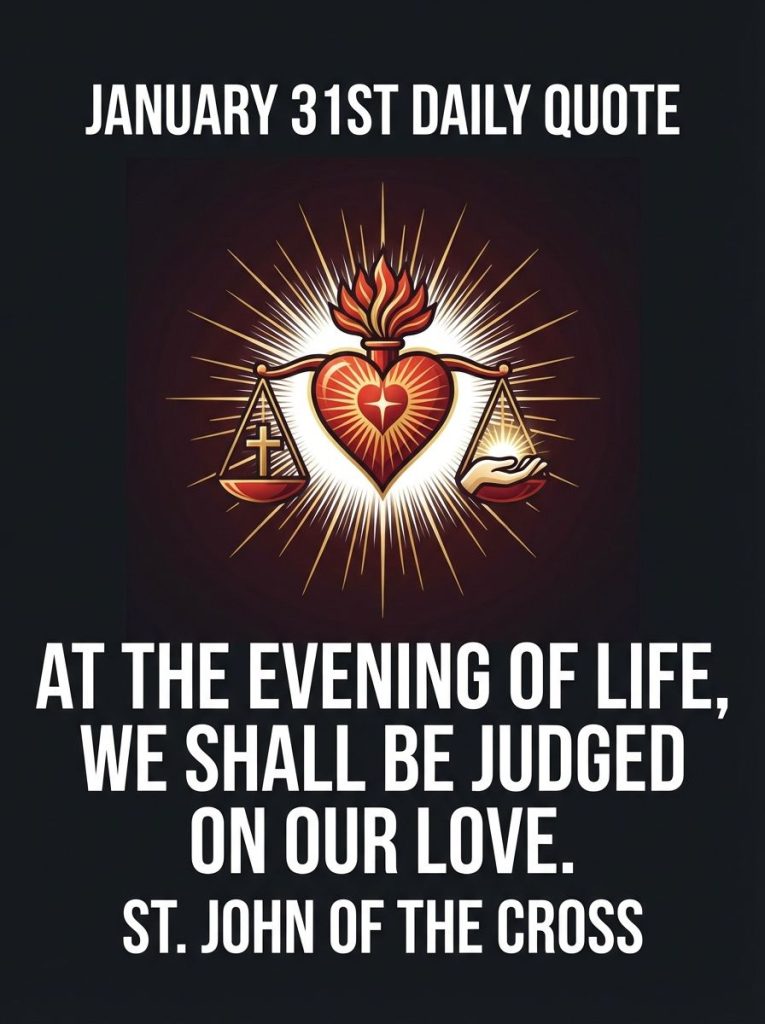 Daily Catholic Quote for 31st JanuaryBy Bishop John Kobina Louis / January 31, 2026 / Quotes / 1 minute of reading St. John of the Cross:“In the evening of life, we will be judged on love alone.” Share this with a friend WhatsApp Facebook Twitter / X Pinterest Linkedin