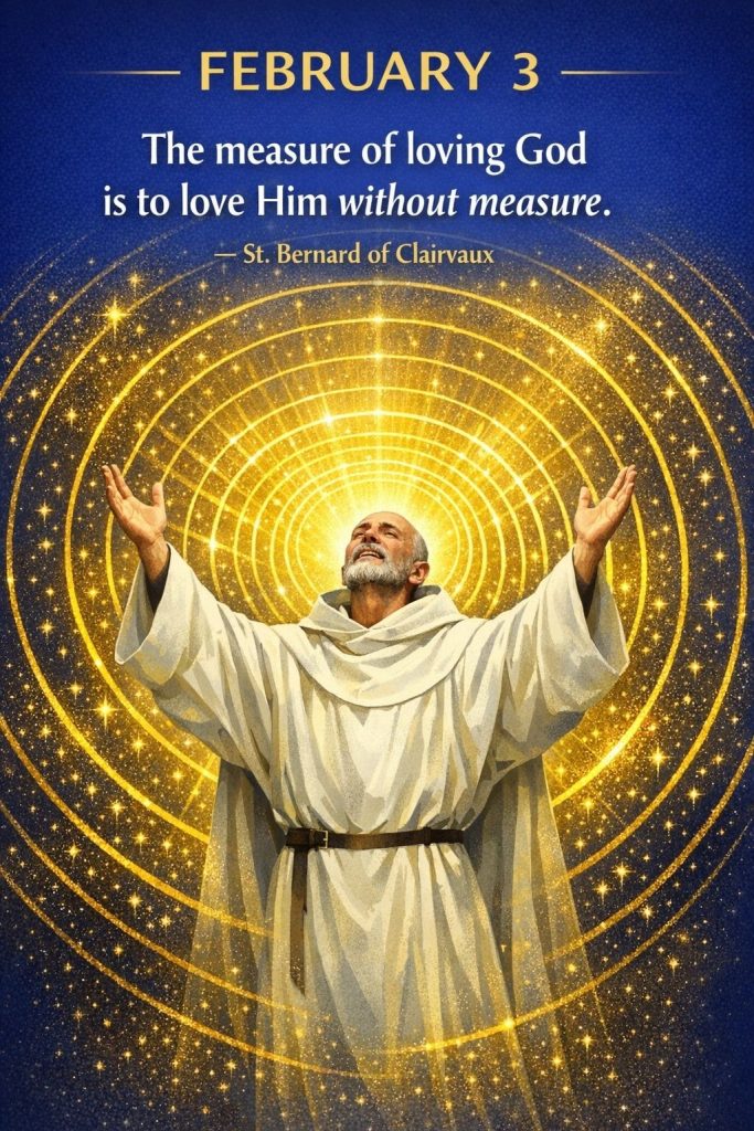 Catholic Quote for FEBRUARY 3By Bishop John Kobina Louis / February 3, 2026 / Quotes / 1 minute of reading St. Bernard of Clairvaux – “The measure of loving God is to love Him without measure.” Share this with a friend WhatsApp Facebook Twitter / X Pinterest Linkedin