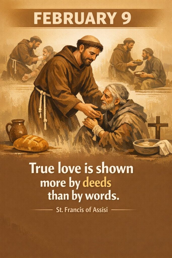 Catholic Quote for FEBRUARY 9By Bishop John Kobina Louis / February 9, 2026 / Quotes / 1 minute of reading St. Francis of Assisi – “True love is shown more by deeds than by words.” Share this with a friend WhatsApp Facebook Twitter / X Pinterest Linkedin