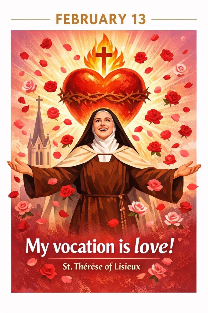 Catholic Quote for FEBRUARY 13By Bishop John Kobina Louis / February 13, 2026 / Quotes / 1 minute of reading St. Thérèse of Lisieux – “My vocation is love!” Share this with a friend WhatsApp Facebook Twitter / X Pinterest Linkedin
