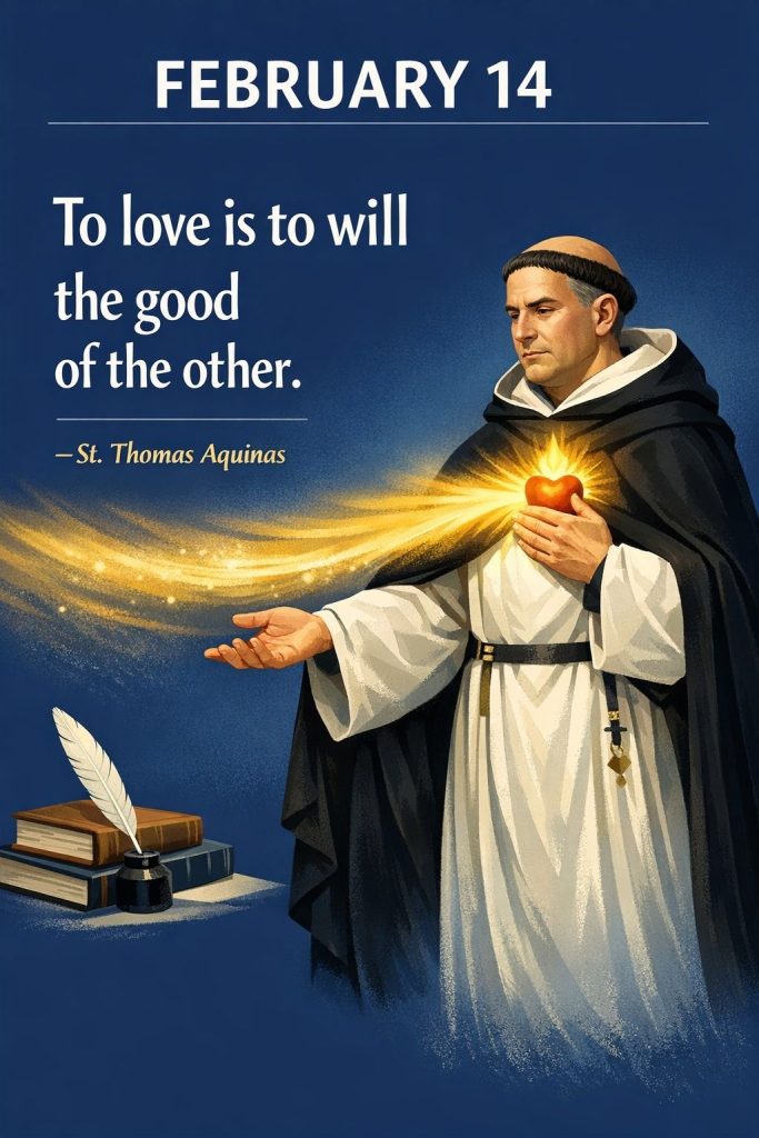 Catholic Quote for FEBRUARY 14By Bishop John Kobina Louis / February 14, 2026 / Quotes / 1 minute of reading St. Thomas Aquinas – “To love is to will the good of the other.” Share this with a friend WhatsApp Facebook Twitter / X Pinterest Linkedin