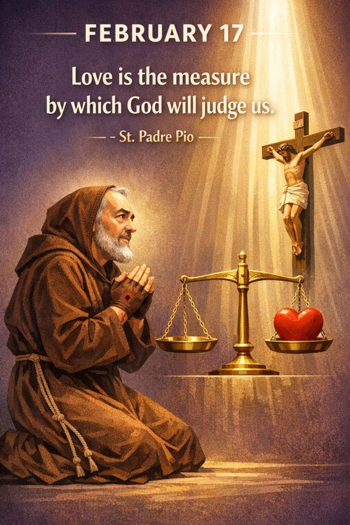 Catholic Quote for FEBRUARY 17By Bishop John Kobina Louis / February 17, 2026 / Quotes / 1 minute of reading St. Padre Pio – “Love is the measure by which God will judge us.” Share this with a friend WhatsApp Facebook Twitter / X Pinterest Linkedin