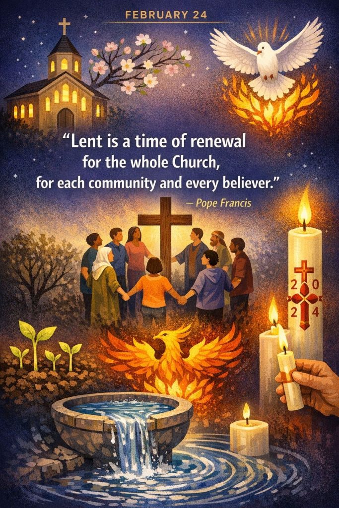 Lenten Quote for 24th FebruaryBy Bishop John Kobina Louis / February 24, 2026 / Quotes / 1 minute of reading Pope Francis:“Lent is a time of renewal for the whole Church, for each community and every believer.” Share this with a friend WhatsApp Facebook Twitter / X Pinterest Linkedin