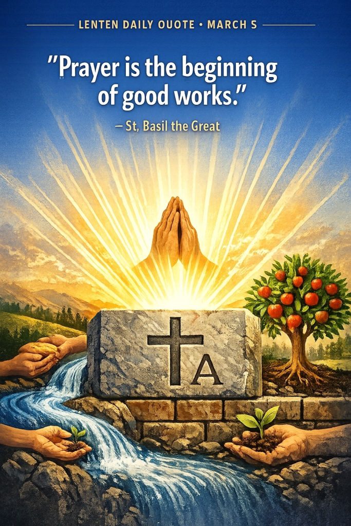 Lenten Quote for 5th MarchBy Bishop John Kobina Louis / March 5, 2026 / Quotes / 1 minute of reading St. Basil the Great:“Prayer is the beginning of good works.” Share this with a friend WhatsApp Facebook Twitter / X Pinterest Linkedin