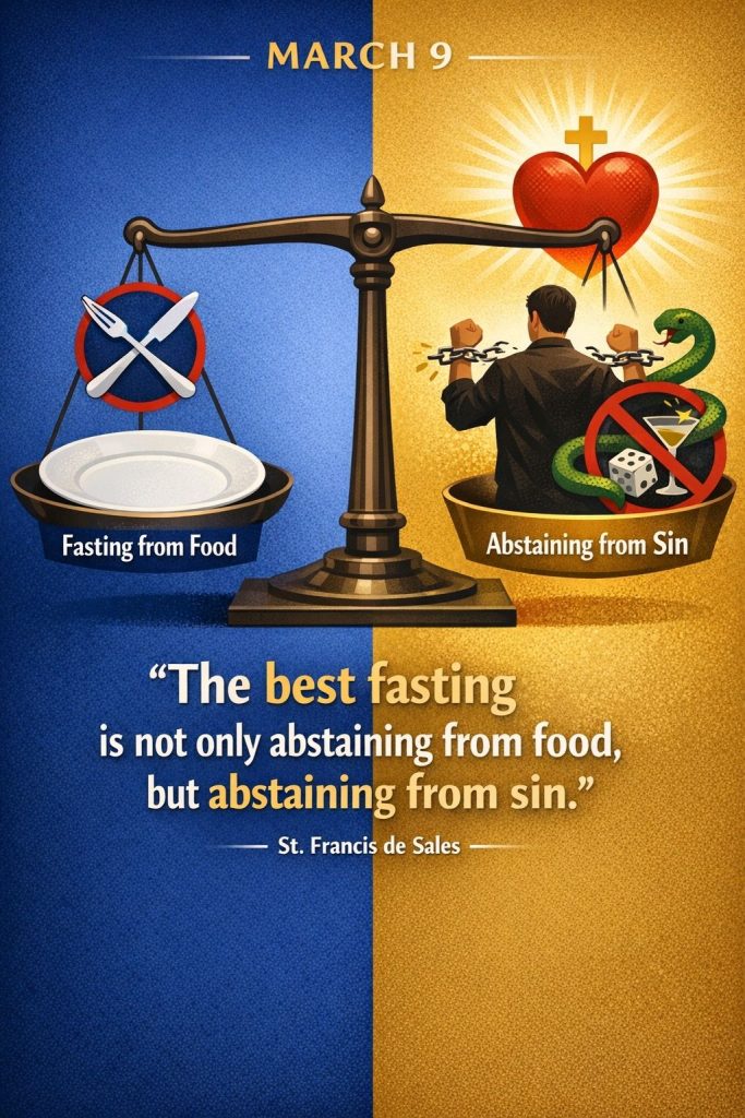 Lenten Quote for 9th MarchBy Bishop John Kobina Louis / March 9, 2026 / Quotes / 1 minute of reading St. Francis de Sales“The best fasting is not only abstaining from food, but abstaining from sin.” Share this with a friend WhatsApp Facebook Twitter / X Pinterest Linkedin