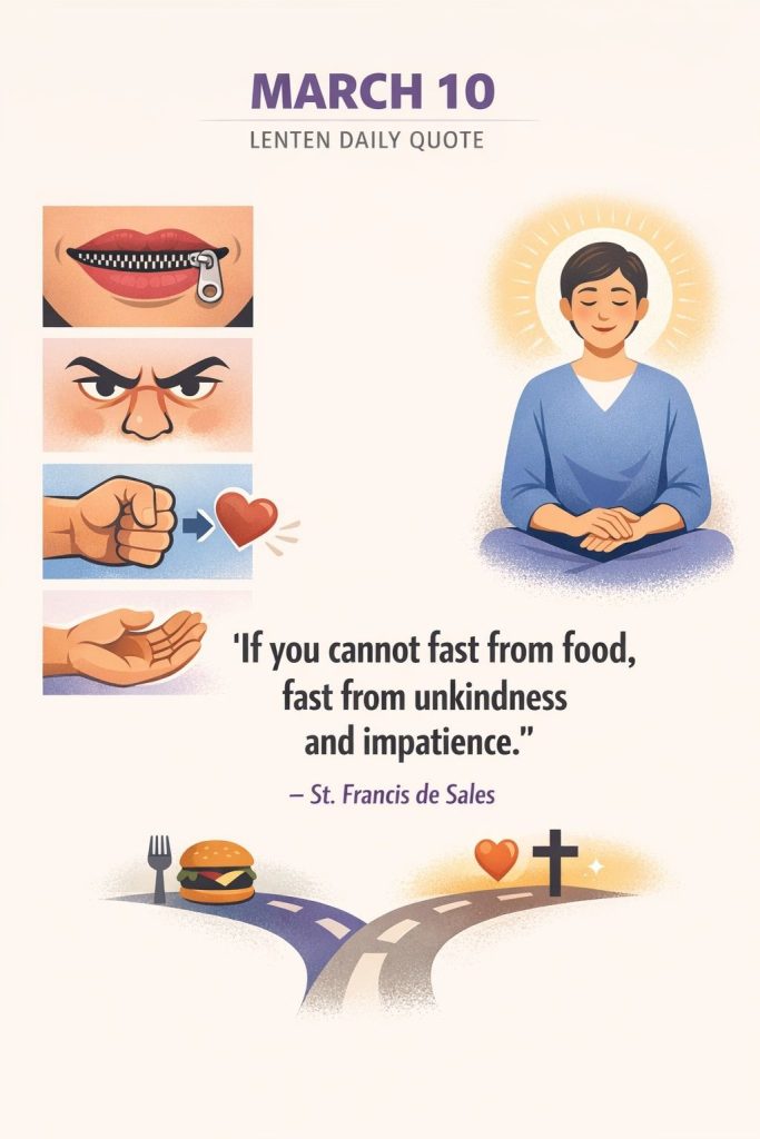 Lenten Quote for 10th MarchBy Bishop John Kobina Louis / March 10, 2026 / Quotes / 1 minute of reading St. Francis de Sales“If you cannot fast from food, fast from unkindness and impatience.” Share this with a friend WhatsApp Facebook Twitter / X Pinterest Linkedin