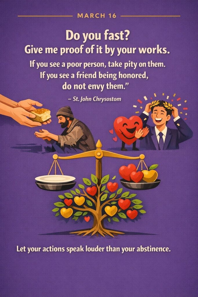 “Do you fast? Give me proof of it by your works. If you see a poor person, take pity on them. If you see a friend being honored, do not envy them.”