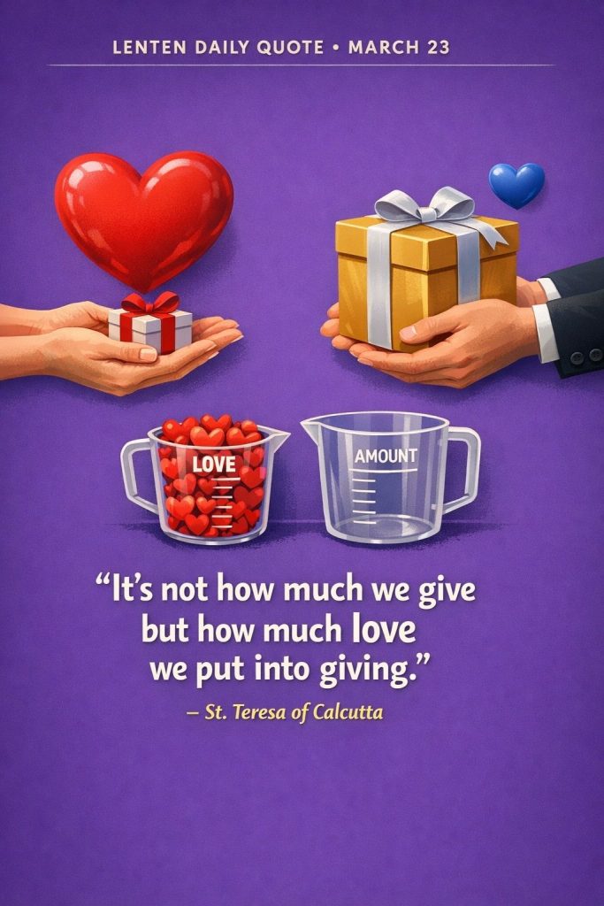 Lenten Quote for 23rd MarchBy Bishop John Kobina Louis / March 23, 2026 / Quotes / 1 minute of reading St. Teresa of Calcutta:“It’s not how much we give but how much love we put into giving.” Share this with a friend WhatsApp Facebook Twitter / X Pinterest Linkedin
