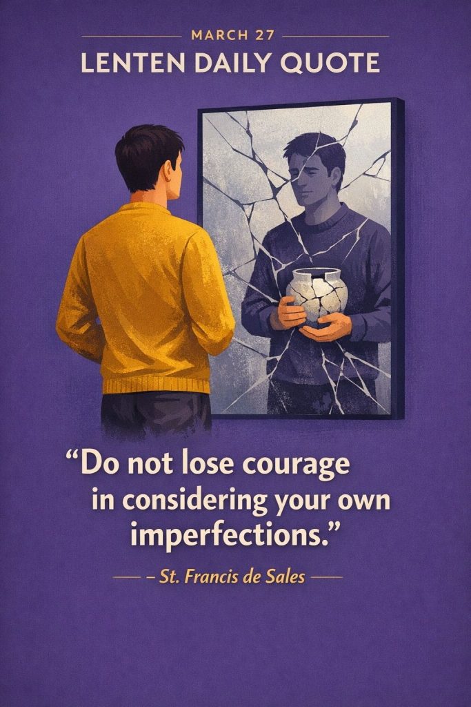 Lenten Quote for 27th MarchBy Bishop John Kobina Louis / March 27, 2026 / Quotes / 1 minute of reading St. Francis de Sales:“Do not lose courage in considering your own imperfections.” Share this with a friend WhatsApp Facebook Twitter / X Pinterest Linkedin