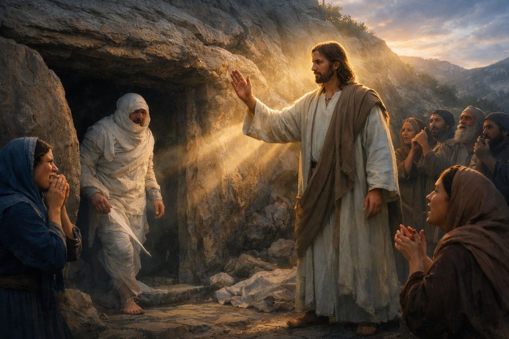 When Jesus finally arrives at the tomb, He simply calls out: “Lazarus, come out!” (John 11:43). At that powerful command, Lazarus walks out alive. This reveals something extraordinary: for Jesus, restoring someone to earthly life is as simple as waking a person from sleep. His divine authority extends even over death itself.