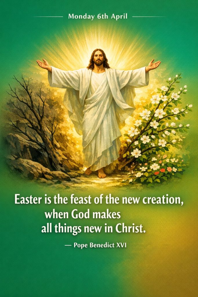 Quote for Monday 6th AprilBy Bishop John Kobina Louis / April 6, 2026 / Quotes / 1 minute of reading “Easter is the feast of the new creation, when God makes all things new in Christ.”— Pope Benedict XVI Share this with a friend WhatsApp Facebook Twitter / X Pinterest Linkedin