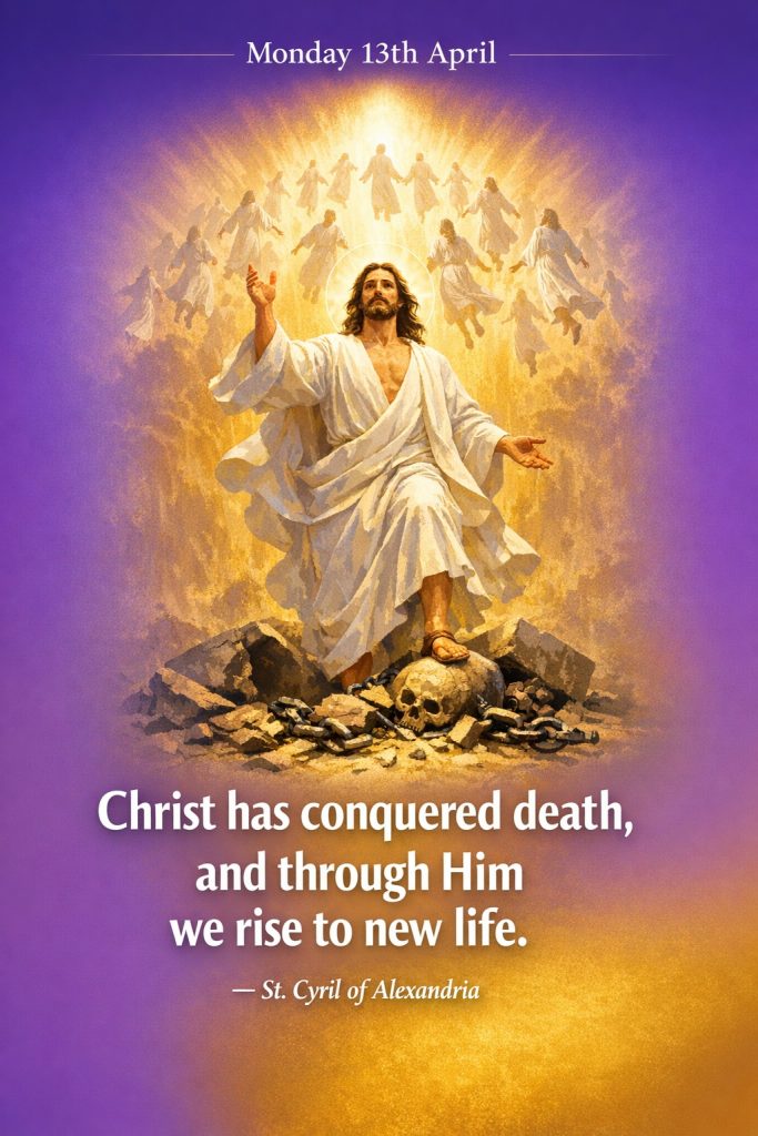 Quote for Monday 13th AprilBy Bishop John Kobina Louis / April 13, 2026 / Quotes / 1 minute of reading “Christ has conquered death, and through Him we rise to new life.”— St. Cyril of Alexandria Share this with a friend WhatsApp Facebook Twitter / X Pinterest Linkedin