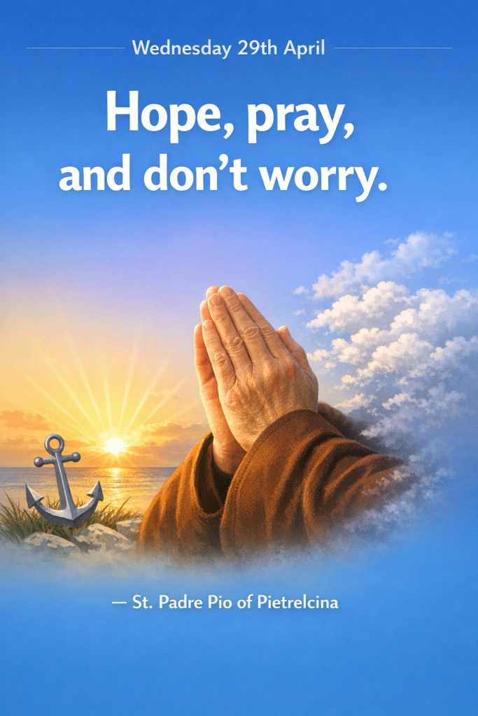 Quote for Wednesday 29th AprilBy Bishop John Kobina Louis / April 29, 2026 / Quotes / 1 minute of reading “Hope, pray, and don’t worry.”— St. Padre Pio of Pietrelcina Related HomiliesLenten Quote for 13th MarchQuote for Wednesday 8th AprilQUOTES ON THE HOLY ROSARY – 5th OctoberLenten Quote for 21st March Share this with a friend WhatsApp Facebook Twitter / X Pinterest Linkedin